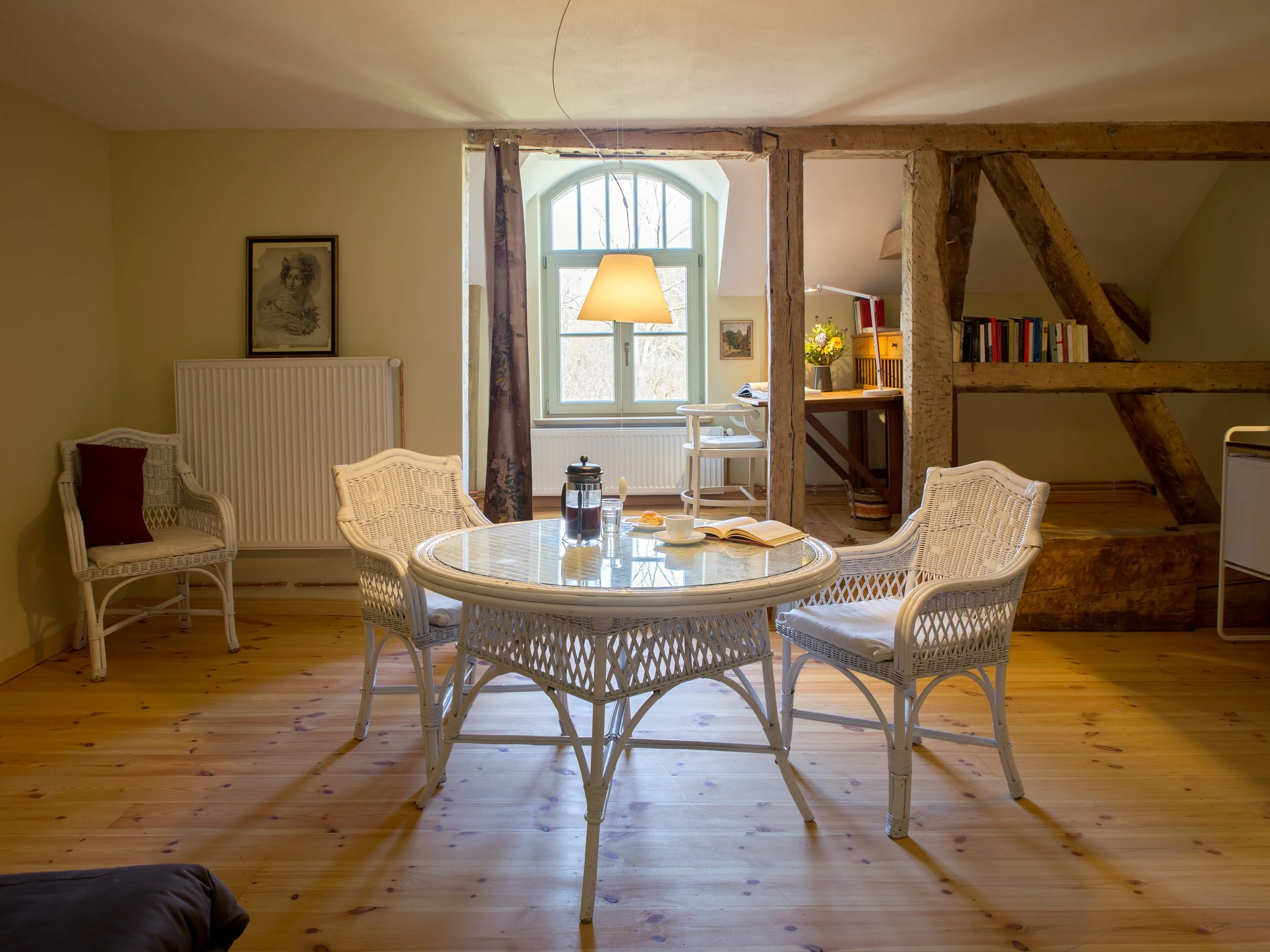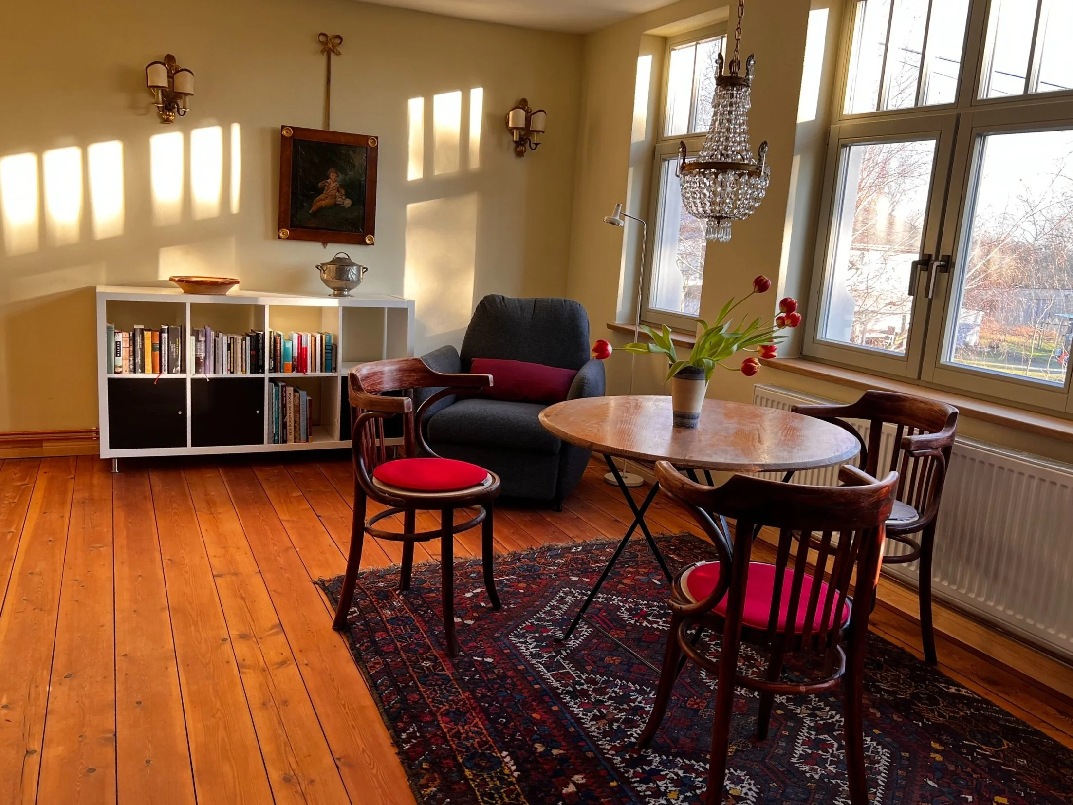 Tisch für bis zu 14 Personen (weiterer Tisch möglich), Sitzecke, Musikanlage, Tonträger, Kaminofen